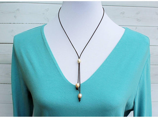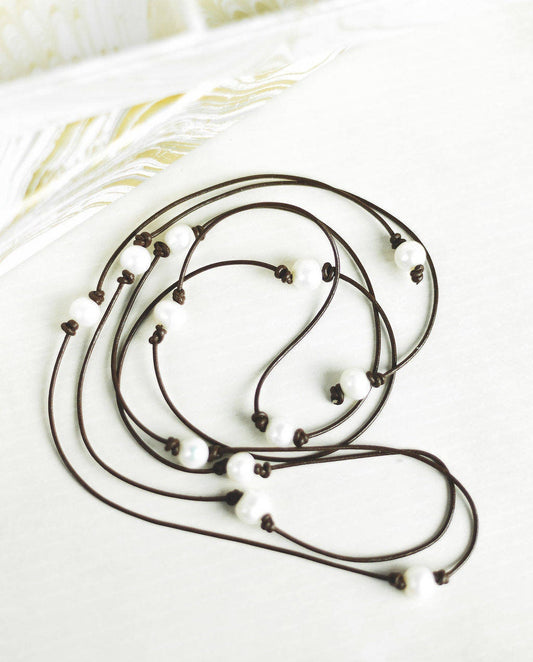 Convertible Leather Pearl Necklace, Adjustable Lariat, Bohemian Jewelry
