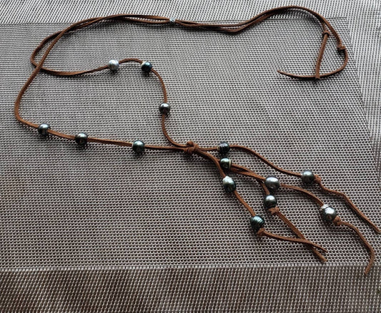 Tahitian Pearl Suede Leather Necklace: Boho Lariat Style