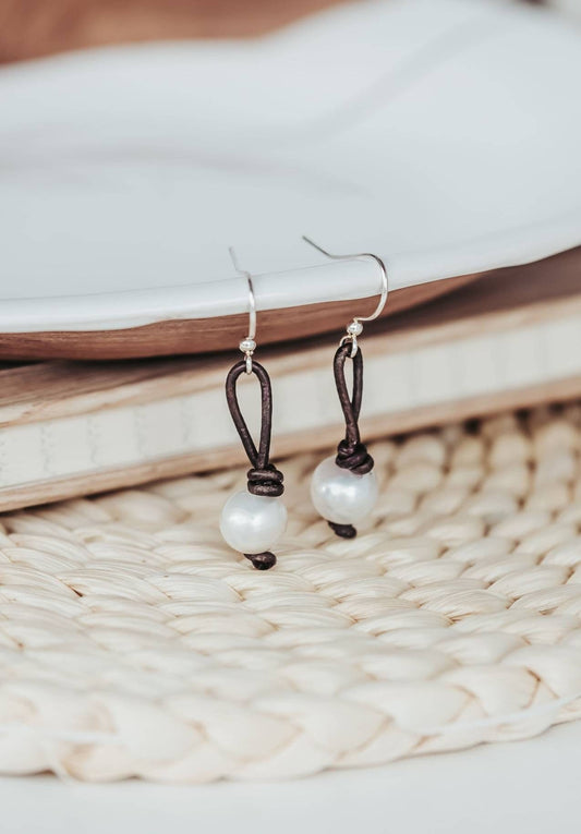 Boho Leather Knot Earrings, Freshwater Pearl Dangles