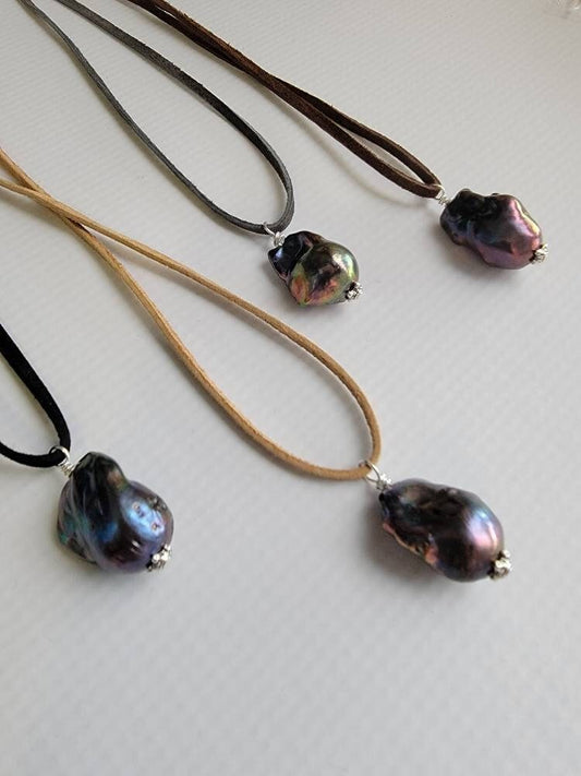 Large Baroque Flameball Pearl Leather Necklace: Silver Accent Beads