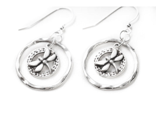 Silver Dragonfly hoop earrings, dragon fly inside hoop ear dangle