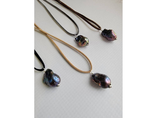 Large Baroque Flameball Pearl Leather Necklace: Silver Accent Beads