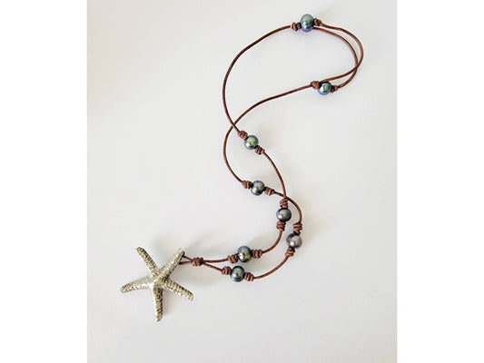 Leather Pearl Necklace: Sterling Silver Starfish Pendant, Adjustable Length