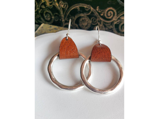 Hammered Hoop Dangly Earrings, Brown Leather Jewelry, 3rd Anniversary Gift for Wife